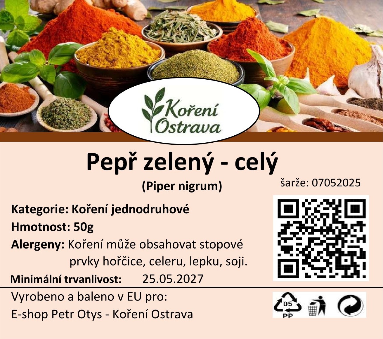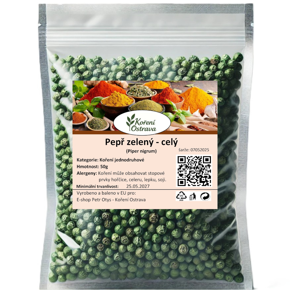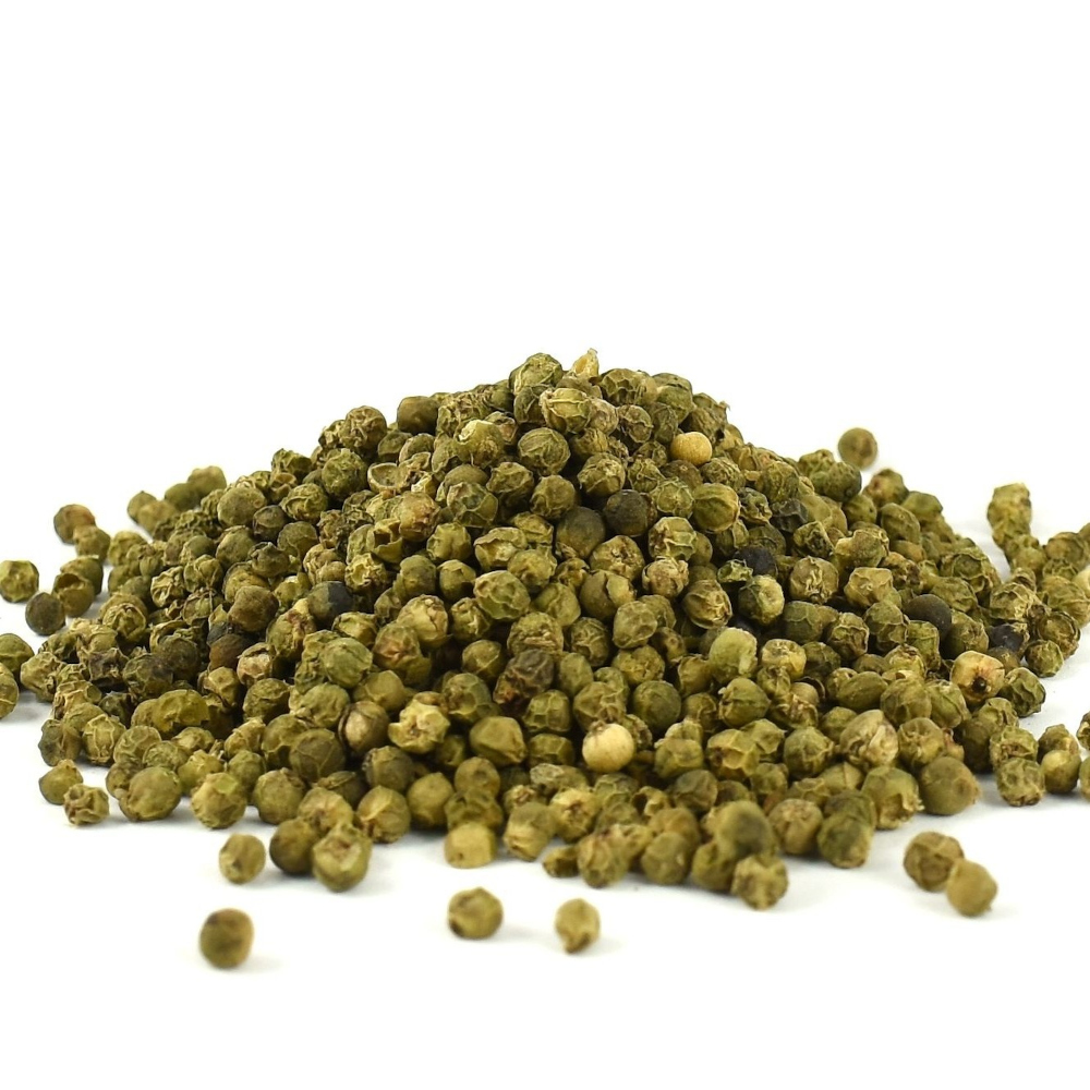 Zelený pepř (Piper nigrum) pochází z tropických oblastí Indie a jihovýchodní Asie. Tento pepř se sklízí, když jsou plody ještě nezralé a zelené. Celé kuličky zeleného pepře mají jemnou, svěží a ovocnou chuť s mírnou pálivostí, která je méně intenzivní než u černého pepře. Používá se především v omáčkách, marinádách, salátech nebo jako dekorace na masových a rybích pokrmech.