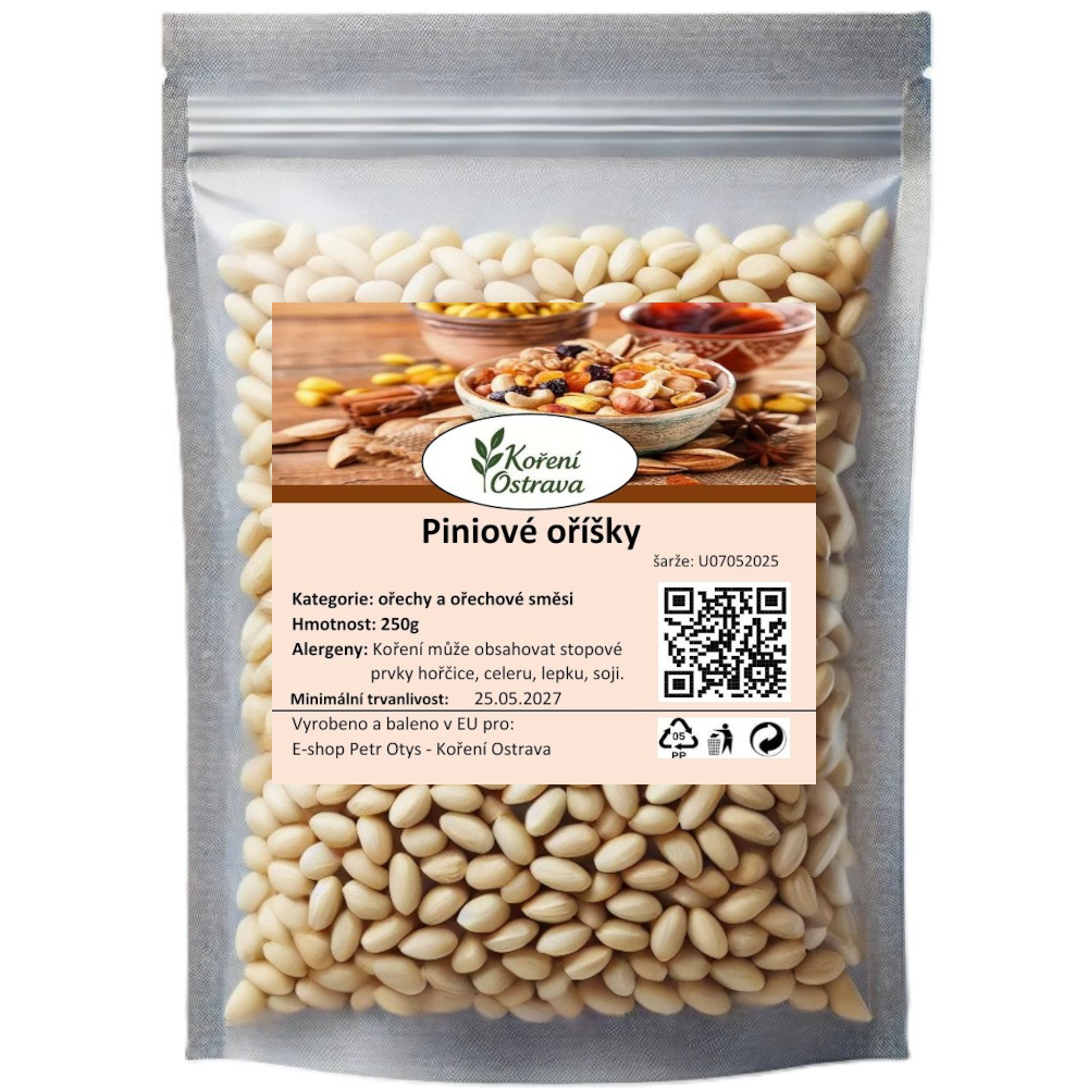 Popis a chuť: Piniové oříšky jsou prémiovou delikatesou pro všechny, kteří si chtějí dopřát to nejlepší. Jejich jemně máslová chuť a lehce pryskyřičný nádech dodávají pokrmům jedinečný luxusní charakter. Skvěle se hodí na samotné mlsání, do salátů, pesta, těstovinových pokrmů, pečiva nebo jako ozdoba dezertů. Každé sousto přináší harmonii jemné chuti a zdraví prospěšných látek, které potěší i ty nejnáročnější gurmány.