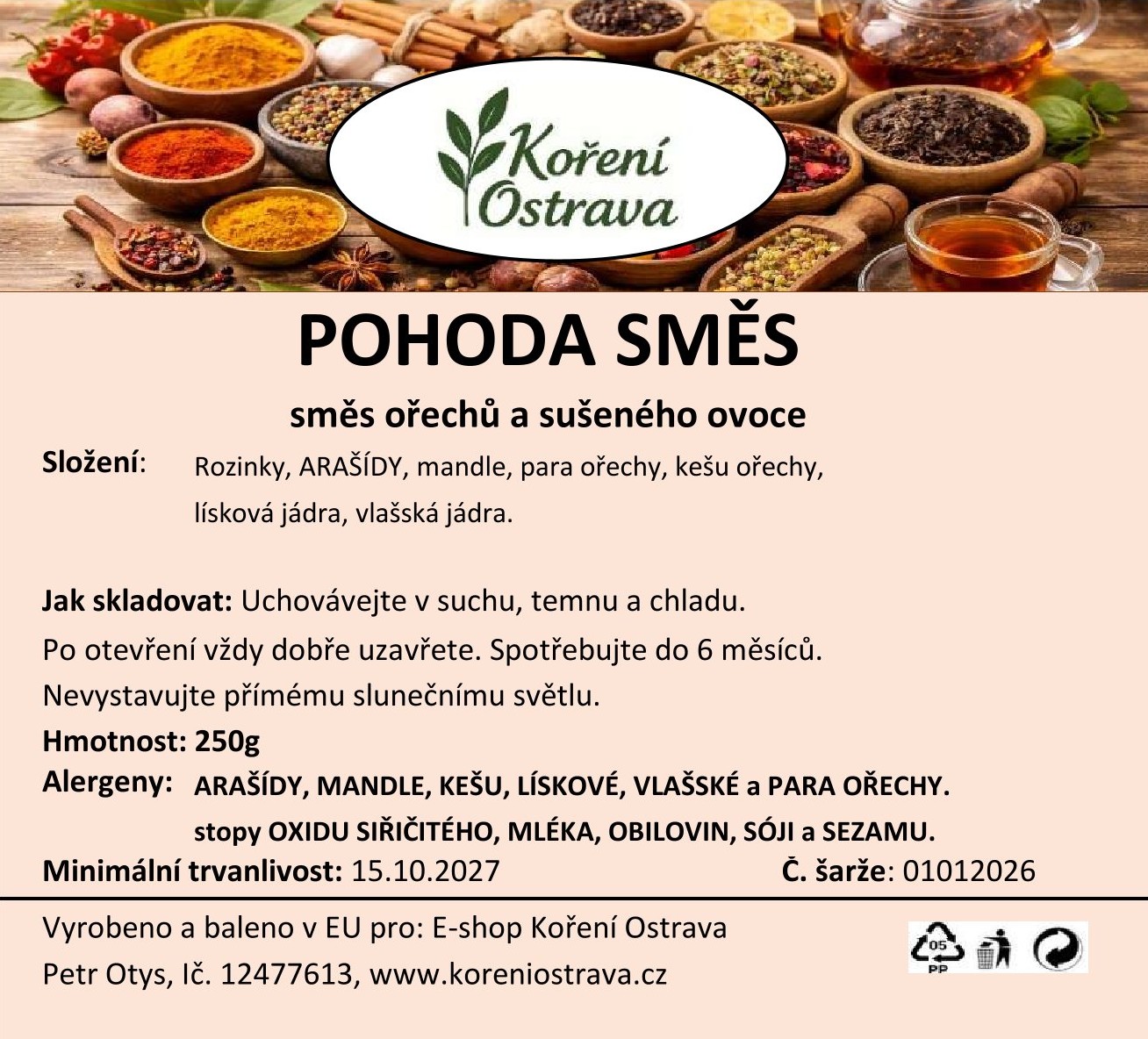 Popis a chuť: Pohoda směs je skvělou volbou pro chvíle, kdy si chceš dopřát něco dobrého a pestrého. Každé sousto přináší harmonii chutí – jemně sladké rozinky a brusinky, exotické tóny papáji a ananasu, máslovou chuť mandlí, kešu a lískových jader, doplněnou o jemně krémovou chuť arašídů v jogurtové polevě. Směs je nejen chutná, ale také plná cenných živin a energie. Skvěle se hodí na samostatné mlsání, do snídaňových směsí nebo jako malá radost během dne.
