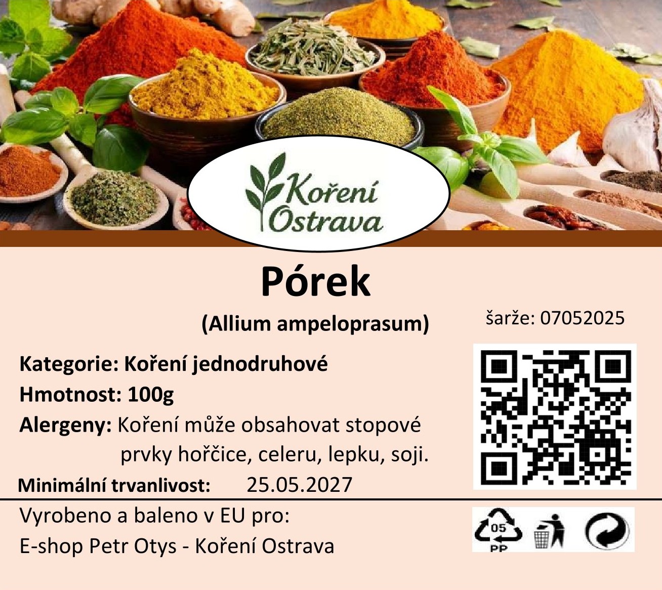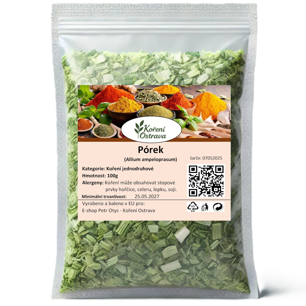 Pórek (Allium ampeloprasum) pochází z oblastí Středomoří a dnes se pěstuje po celém světě. Má jemnou, cibulovou chuť, která je mírnější než u cibule. Používá se jak čerstvý, tak sušený, a je oblíbený v polévkách, omáčkách, salátech, nebo jako přísada do různých pokrmů, zejména v jarní a letní kuchyni.