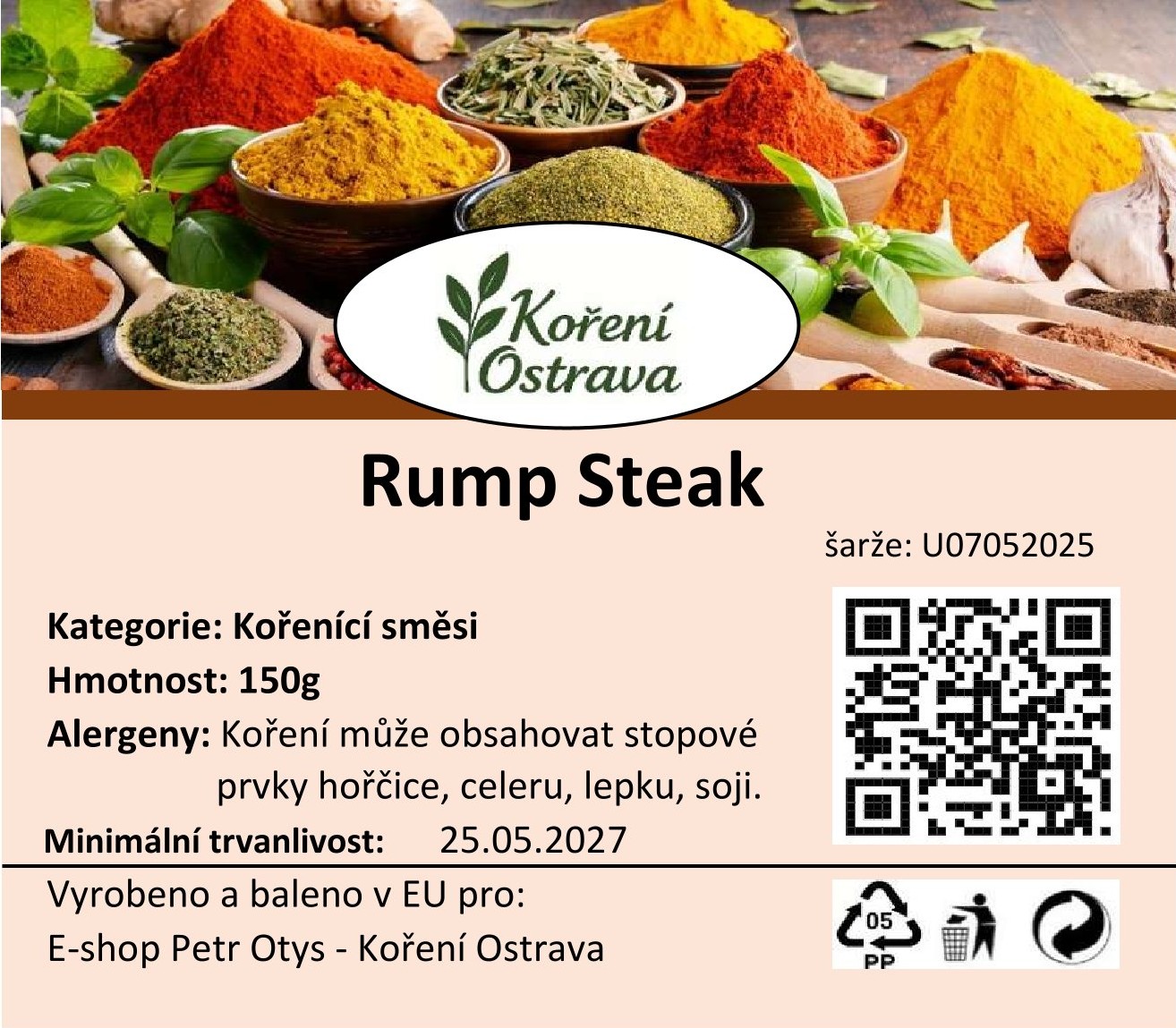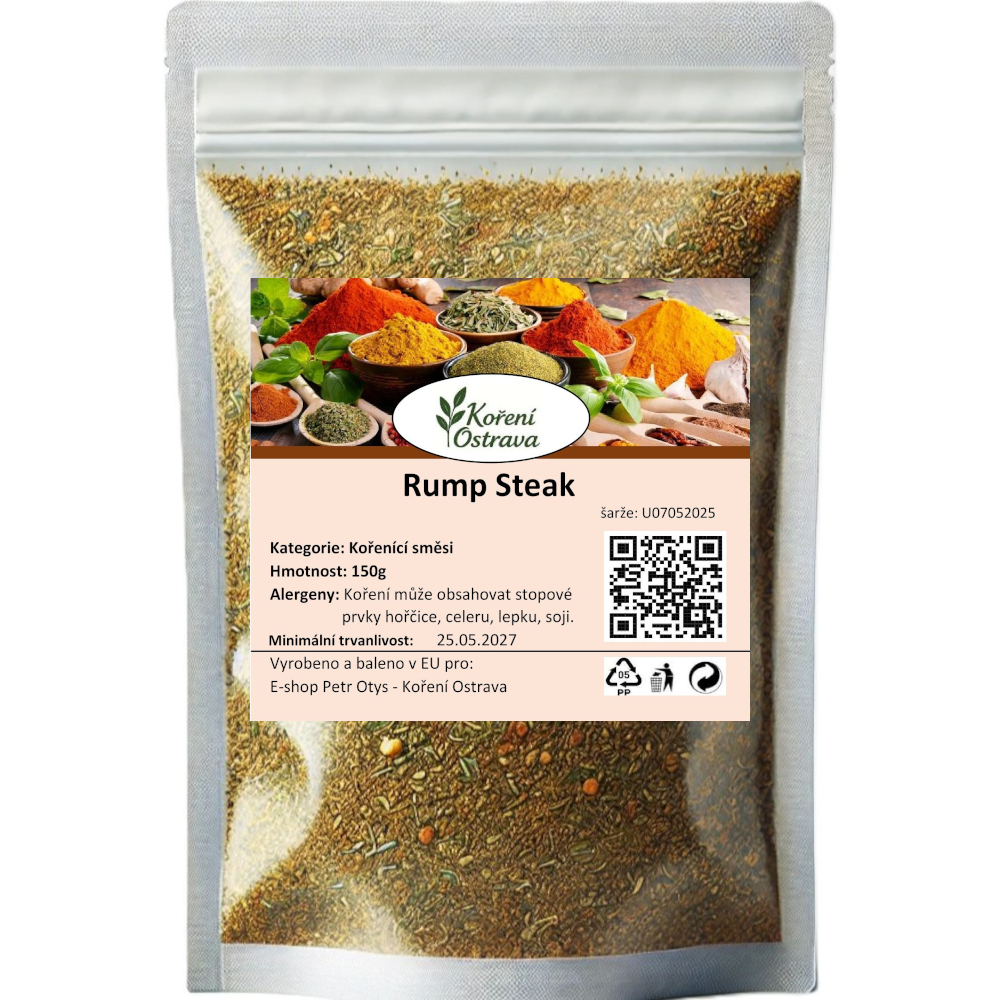 Směs koření Rump Steak je obvykle kombinace různých koření a bylin, které se používají k dochucení hovězích steaků, zejména rump steaku (zadního hovězího). Tato směs je vytvořena tak, aby zvýraznila chuť masa a dodala mu příjemnou vůni a pikantnost.
