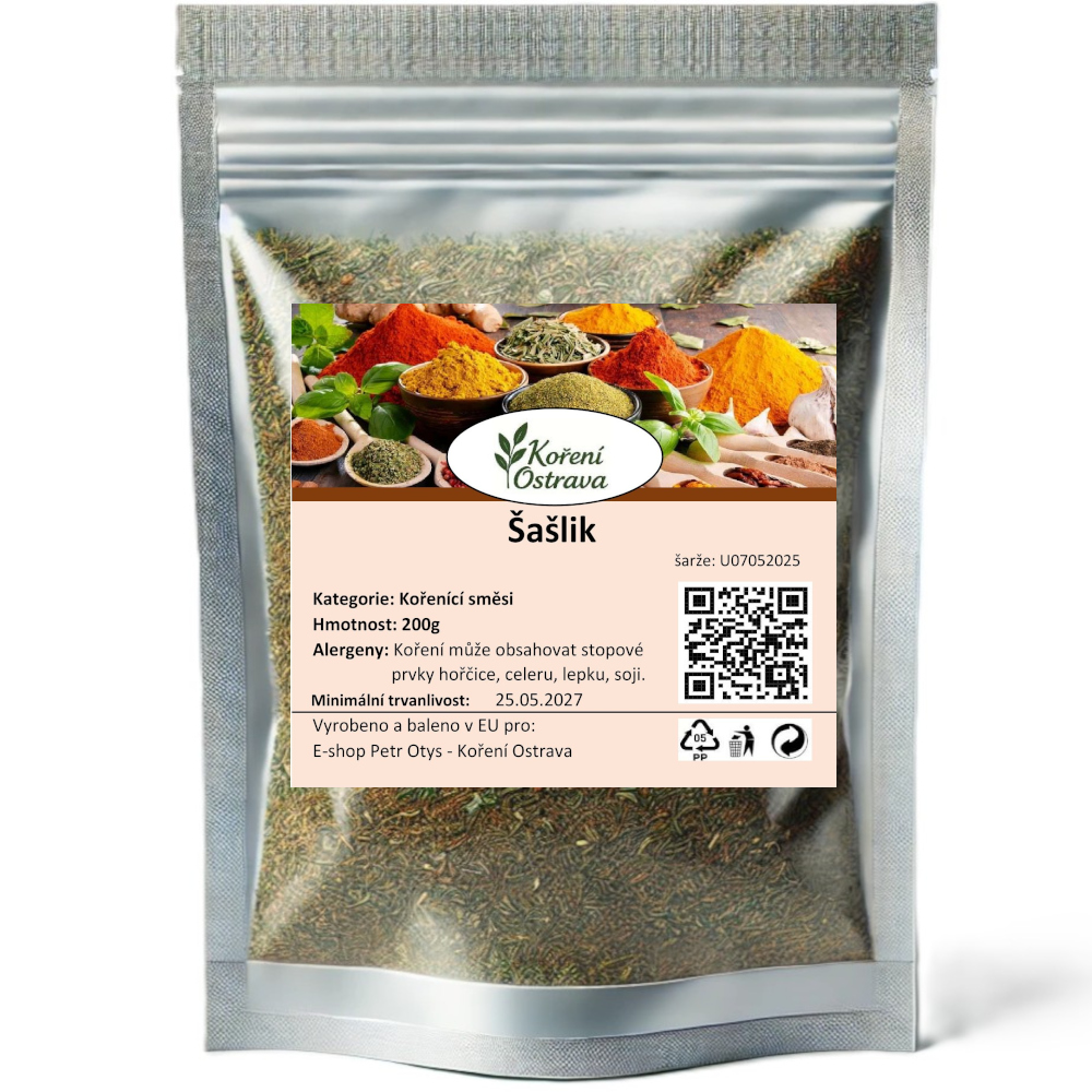Použití: Tradiční směs určená pro přípravu šašliku – oblíbeného kavkazského a východoevropského pokrmu z marinovaného masa na jehle. Skvělá na vepřové, hovězí, jehněčí i kuřecí maso. Hodí se pro grilování, pečení nebo opékání na pánvi. Využijete ji i do marinád nebo jako suché koření na zeleninu.