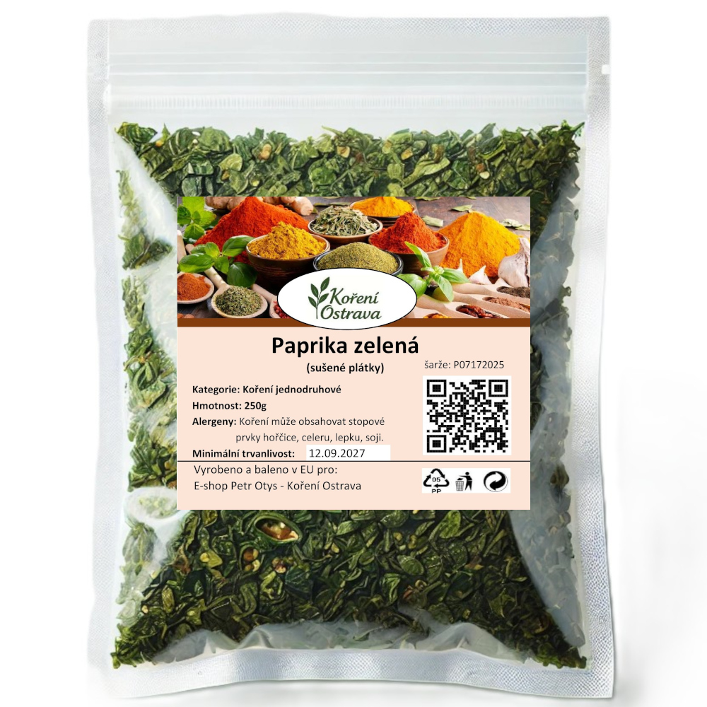 Paprika zelená – plátky (Capsicum annuum) se vyrábí šetrným sušením čerstvých paprik, které se po nakrájení na tenké plátky suší tak, aby si uchovaly svou přirozenou barvu, chuť i aroma. Díky sušené formě mají dlouhou trvanlivost a snadné použití.
