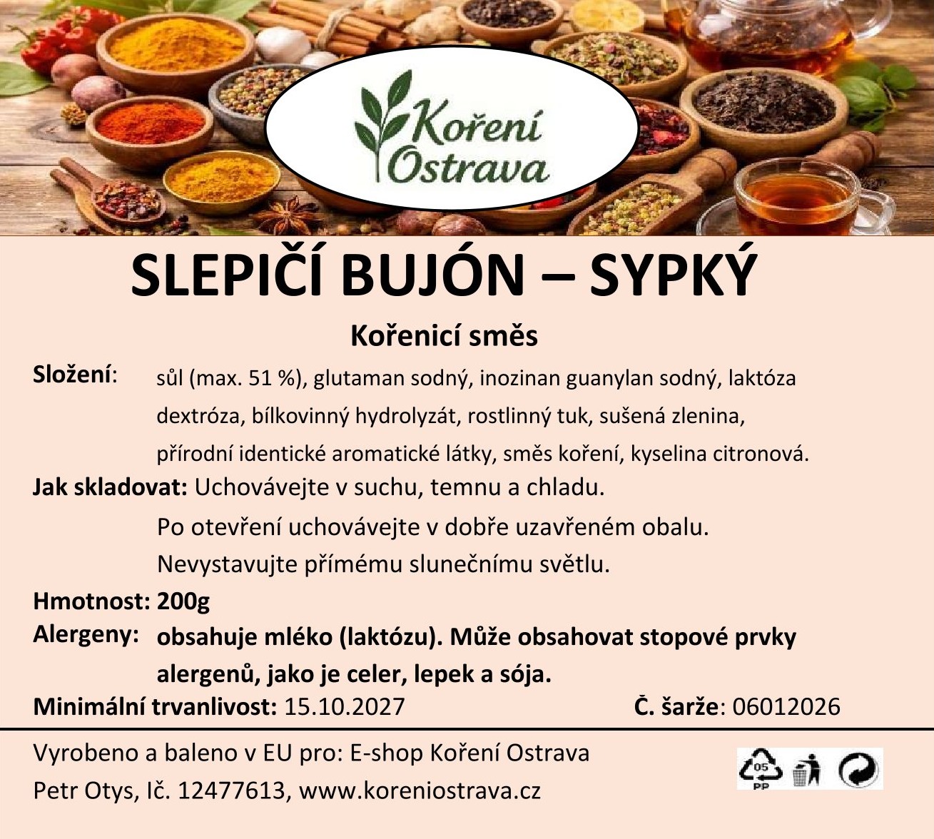 Použití: Univerzální směs pro přípravu slepičího vývaru, polévek, omáček a podkladů pro dušená jídla. Lze ji použít i pro dochucení rýže, kuskusu, těstovin nebo zeleninových pokrmů. Ideální jako rychlý základ pro domácí vývar, když není po ruce maso nebo vývar z kostí. Dávkování: 2-3 čajové lžičky na 1 litr vody.