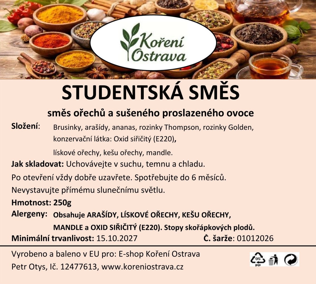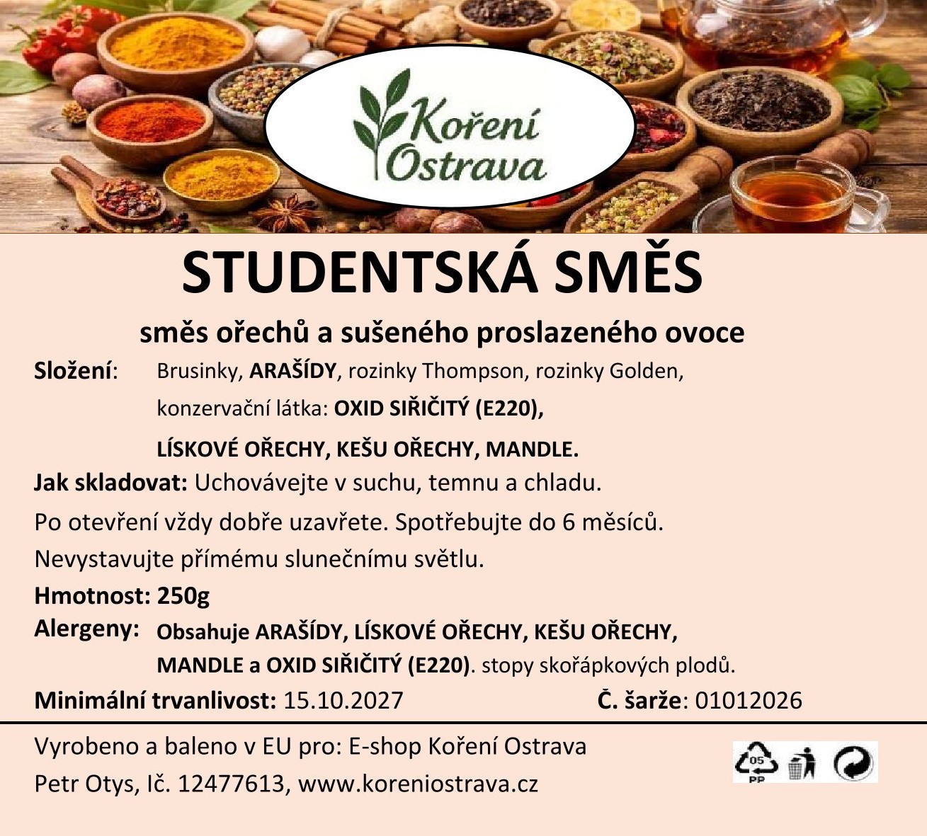 Popis a chuť: Studentská směs je ideální volbou pro všechny, kteří chtějí sáhnout po rychlé, zdravé a chutné svačině. Jemně sladké rozinky a sušené meruňky dodávají směsi ovocnou svěžest, zatímco lísková jádra, mandle a arašídy přinášejí křupavost a máslovou chuť. Tato klasická směs je perfektní na mlsání během dne, do snídaňových směsí, jogurtů nebo jako praktický zdroj energie při práci, sportu či studiu.