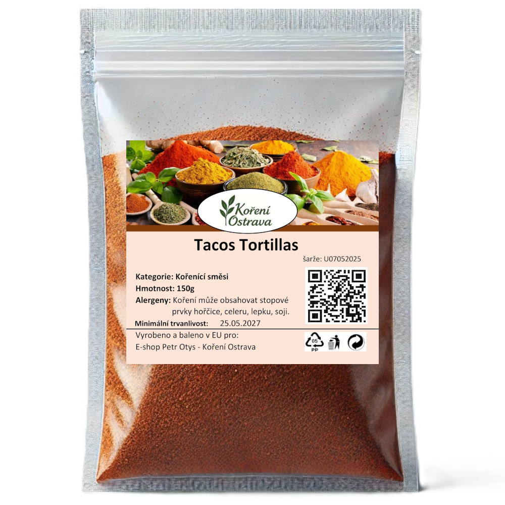 Tacos Tortillas je kořenící směs inspirovaná mexickou kuchyní, která se používá hlavně na ochucení masa do tacos, burritos nebo fajitas. Obsahuje typické mexické koření.