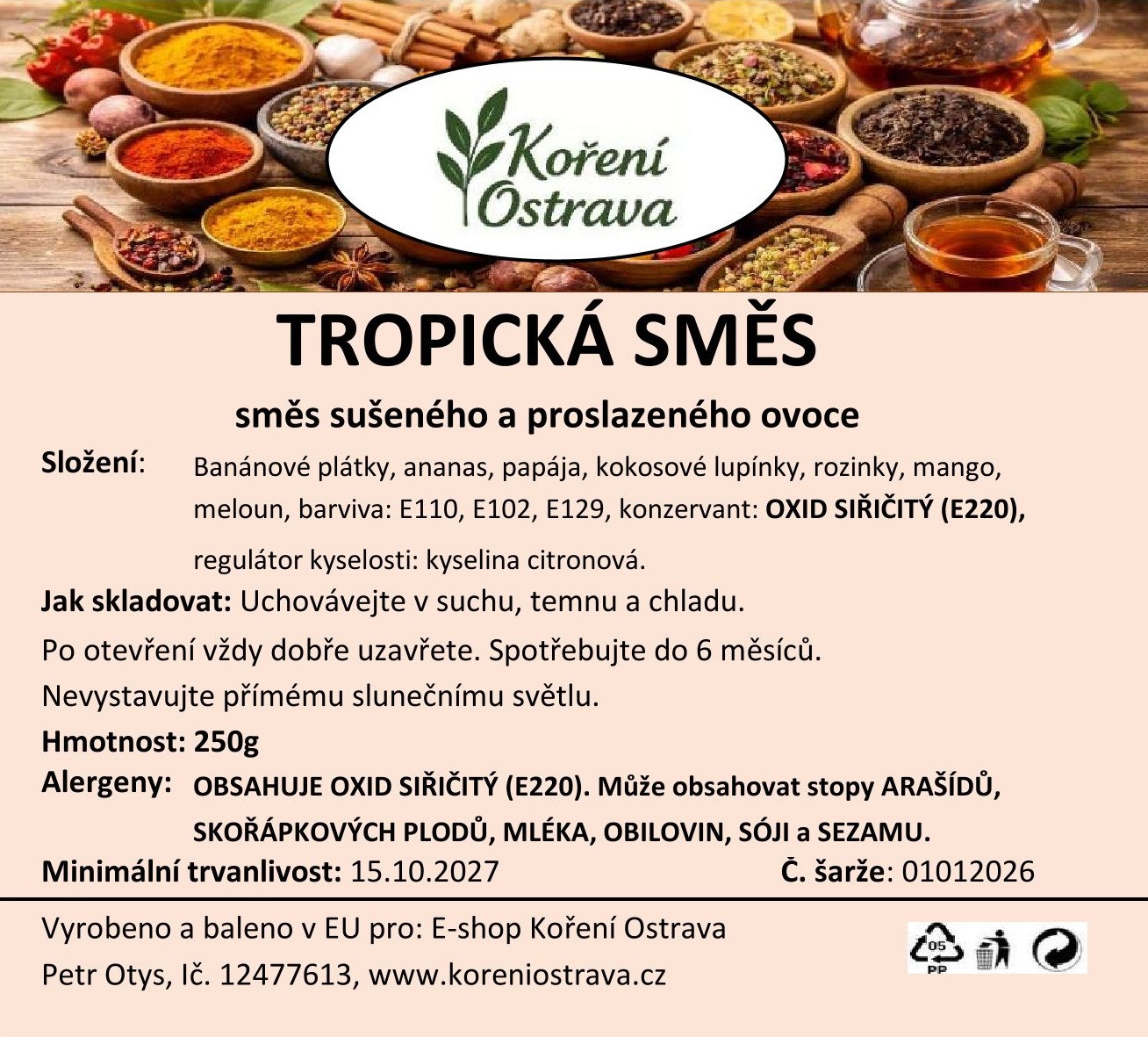 Popis a chuť: Tropická směs je ideální pochoutkou pro všechny, kteří si chtějí dopřát exotiku v každém soustu. Sladké kousky ananasu, papáji a manga přinášejí do směsi šťavnatou sladkost, zatímco kokosové chipsy a banánové plátky dodávají příjemnou křupavost a tropické aroma. Tato barevná směs je nejen chutná, ale i krásná na pohled, skvěle se hodí na mlsání, do snídaňových směsí, jogurtů nebo jako zajímavý doplněk dárkových balíčků.