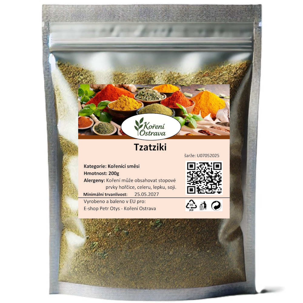 Použití: Směs určená k přípravě osvěžujícího řeckého dipu tzatziki. Stačí ji smíchat s jogurtem nebo zakysanou smetanou, přidat nastrouhanou okurku a kapku olivového oleje. Výborná k pečenému masu, grilované zelenině, pita chlebu nebo jen tak jako omáčka ke grilování.