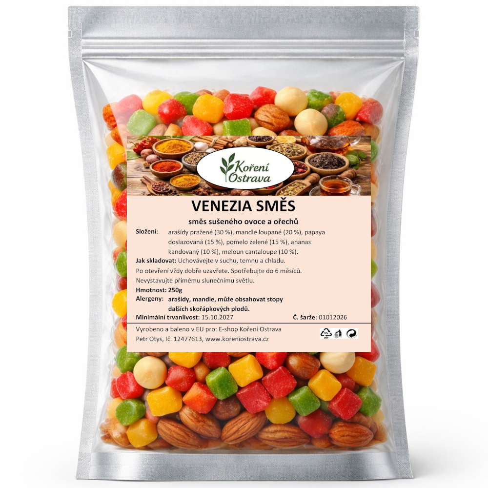 Složení: Arašídy pražené (30 %), mandle loupané (20 %), papaya doslazovaná (15 %), pomelo zelené (15 %), ananas kandovaný (10 %), meloun cantaloupe (10 %).