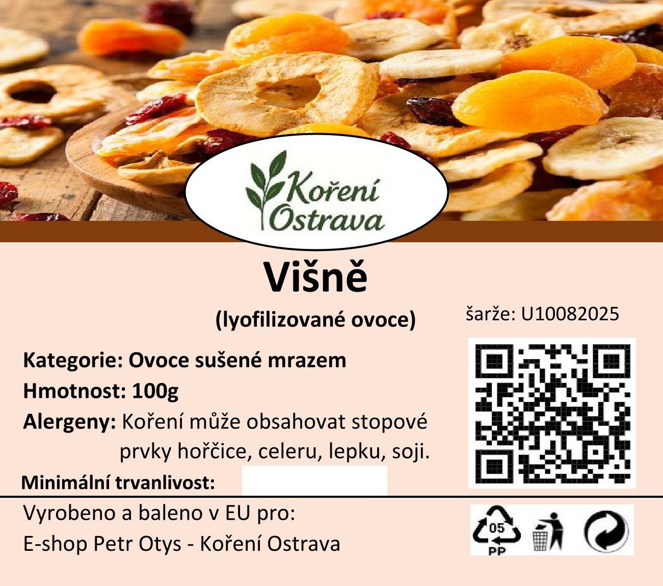 Popis a chuť: Višně (Prunus cerasus) sušené mrazem jsou vyráběny metodou lyofilizace, která zachovává jejich přirozenou barvu, tvar, vůni a vysoký obsah cenných látek. Proces probíhá při velmi nízkých teplotách, kdy se z plodů šetrně odstraní voda, aniž by došlo ke ztrátě vitaminů, minerálů a antioxidantů. Výsledkem jsou lehké, křupavé plody s intenzivní nakyslou chutí a svěží ovocnou vůní. Skvěle se hodí do snídaňových směsí, pečiva, dezertů, smoothie i jako chutný a zdravý snack.