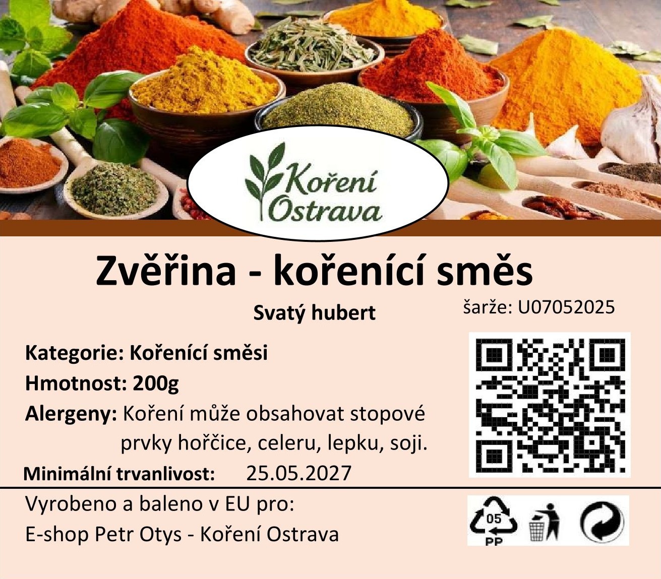 Směs koření "Zvěřina" je kořenící směs určená především pro přípravu pokrmů ze zvěřiny, jako je srnčí, dančí, jelení, divočák nebo zajíc. Směs obvykle obsahuje aromatické bylinky a koření, které zvýrazňují chuť masa a pomáhají odstranit jeho typickou divokou vůni.